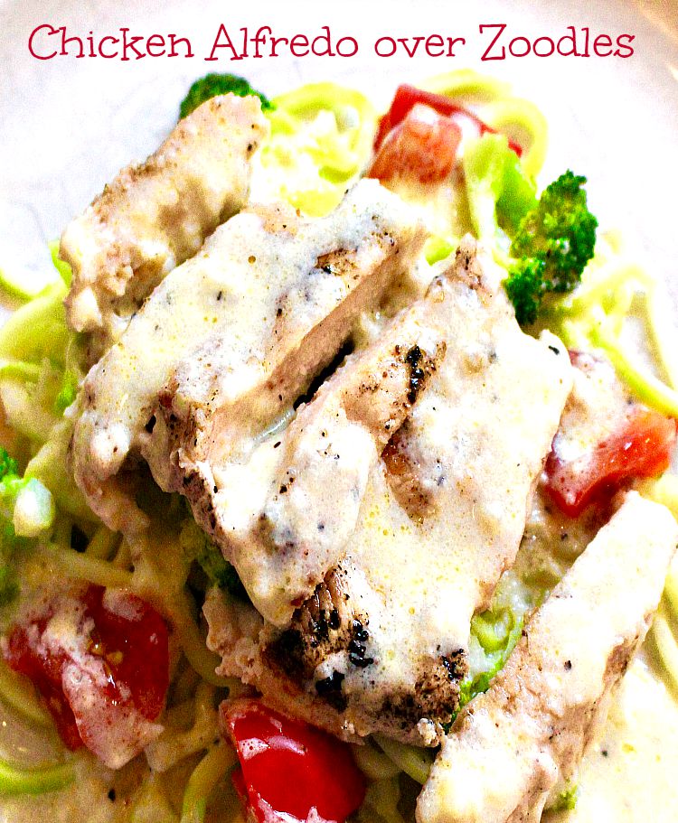 My daughter loves Fettuccine Alfredo. I mean what’s not to like? Butter, cream and cheese…sigh. It’s not the fat content that always got me but the noodles and heaviness of the dish. I took a standard recipe and tweaked it a little to still taste rich and creamy, added some protein and veggies and tossed it with zucchini noodles instead of pasta. I did serve it to my daughter over rice noodles and she said and I quote “this is better than most restaurants mom” Success!